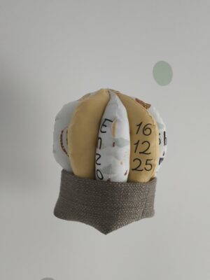 Cubo de diferentes telas combinadas. Datos en cada una de las seis caras: -nombre (cada letra está cosida), -fecha de nacimiento, -longitud con dibujo, -peso, -hora -horóscopo. Relleno de copos de fibra de poliéster. Medidas 15 x 15 x 15 cm.