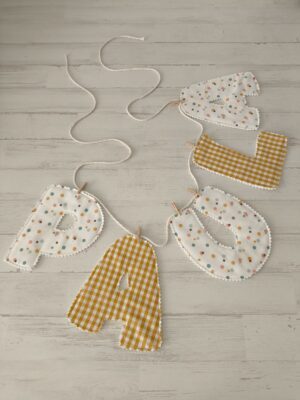 Guirnalda para decorar la habitación de tu peque. ¿Te imaginas cómo quedará el nombre de tu chiquitín en la habitación, junto al cambiador y la cuna? Pregúntame por otros estampados. Medidas de cada letra 15×15 cm aprox.