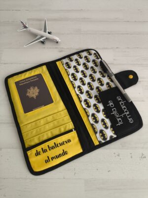 Portadocumentos para viajar con compartimentos de varios tamaños. Medidas cerrado: 13×28 cm; medidas abierto: 26×28 cm. Textos personalizables. Preguntar por otros estampados.