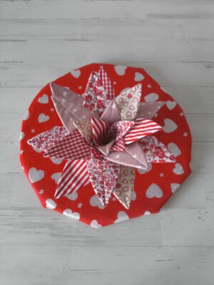 Kit para coser un aloe – Flor de Pascua. Se incluye: telas para planta y maceta, fieltro para el relleno, pajita para dar la vuelta a los pétalos, velcro, estabilizador para la maceta, patrones y guía (archivo descargable). Se muestra una foto de modelo igual o similar a modo de ejemplo del resultado.