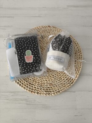 Kit para coser un aloe vera en blanco y negro pequeño. Se incluye: telas para planta y maceta, fieltro para el relleno, pajita para dar la vuelta a los pétalos, patrones y guía (a través de código QR). Se muestra una foto de modelo igual o similar a modo de ejemplo del resultado. Disfruta de…