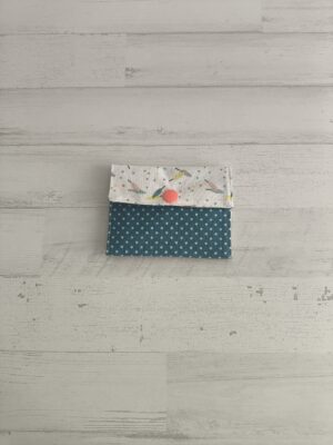 Tarjetero con estampado de tela verde y plumas multicolres. Medidas Tarjetero: 9 x 6 cm.
