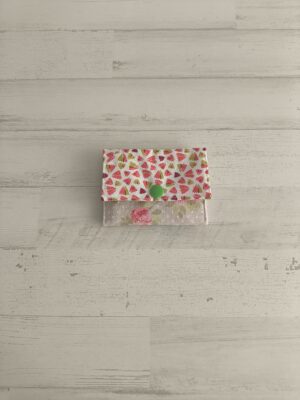 Tarjetero con estampado de rosas y sandías. Medidas Tarjetero: 9 x 6 cm.