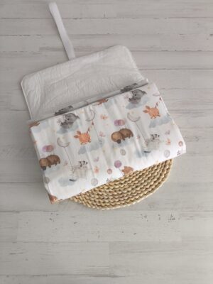 Cambiador con espacio para toallitas y pañales. Realizado en muletón plastificado para su fácil limpieza. Cierre con goma para su fácil apertura y cierre. Costuras de guiado para facilitar el plegado. Medidas extendido: 60 cm x 90 cm. Medidas recogido: 30 cm x 20 cm.