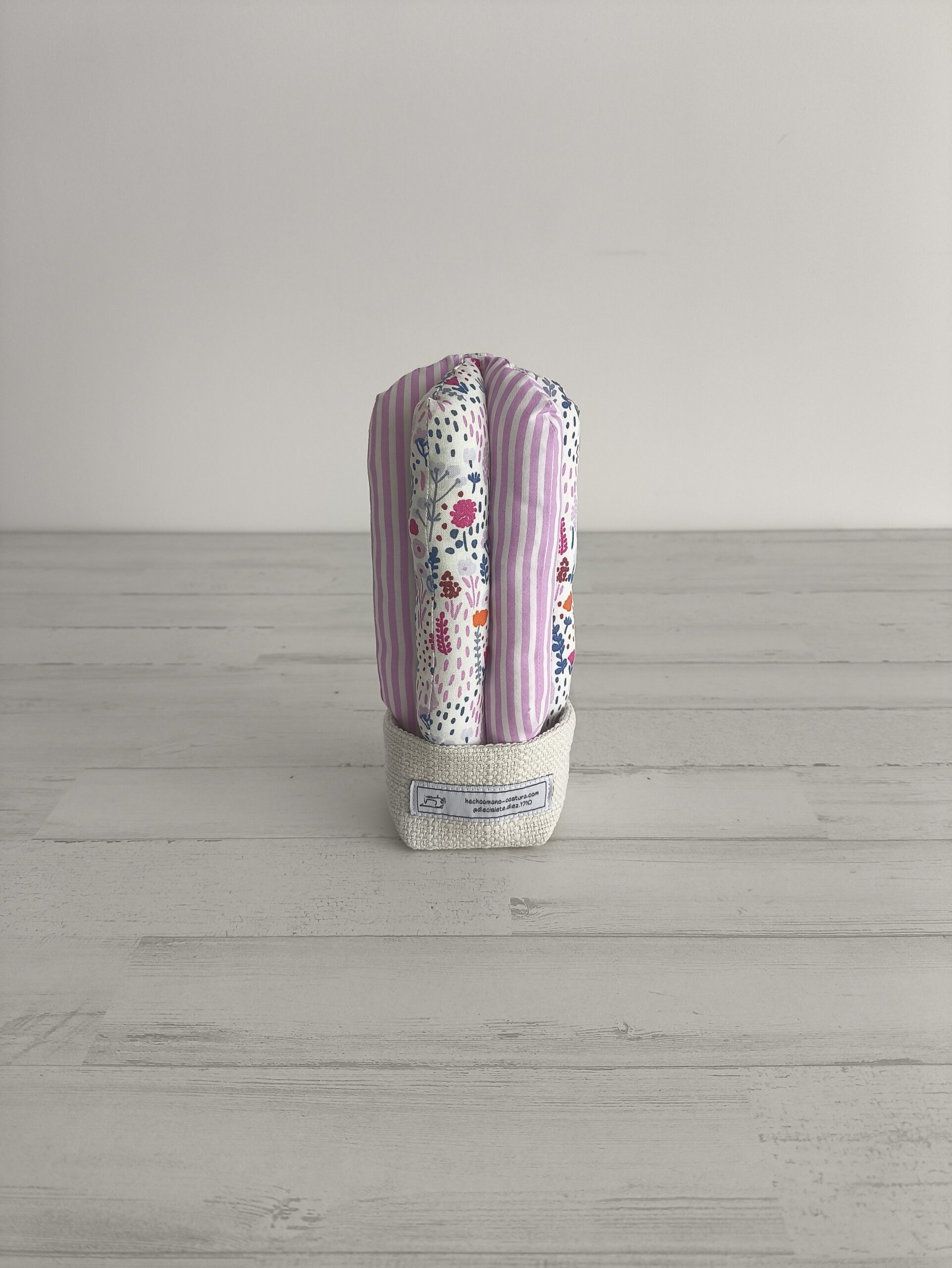 Cactus de tela relleno de copos de fibra de poliéster. Viene con maceta de tela para que no se salga el agua cuando lo riegues… Ahh no, que no hace falta regarlo, que es de tela.