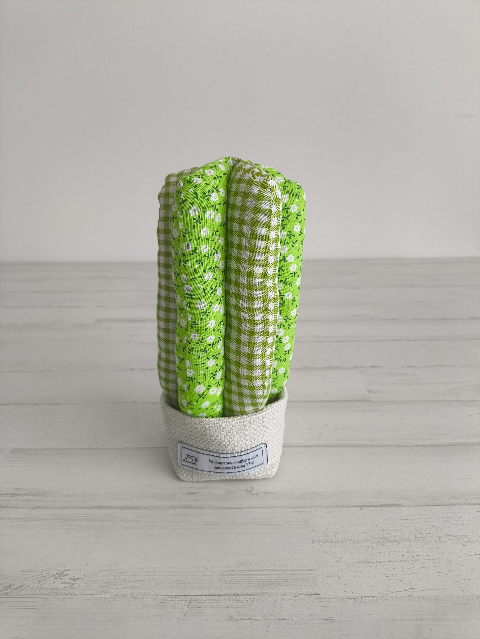 Cactus de tela relleno de copos de fibra de poliéster. Viene con maceta de tela para que no se salga el agua cuando lo riegues… Ahh no, que no hace falta regarlo, que es de tela.