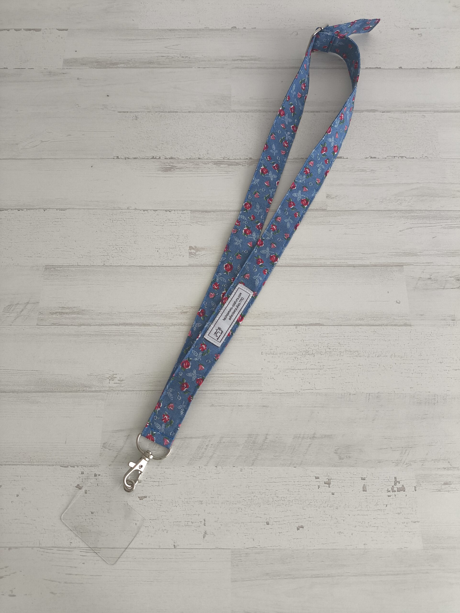 Cuelgamóvil con estampado de flores rojas y fondo azul.