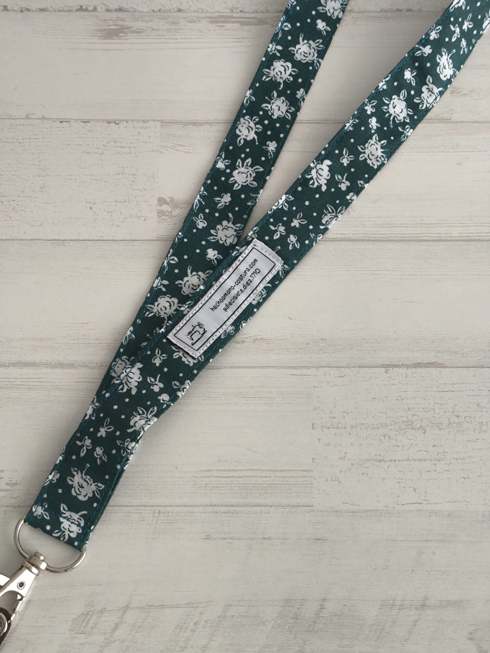 Cuelgamóvil con estampado de flores blancas y fondo verde oscuro.