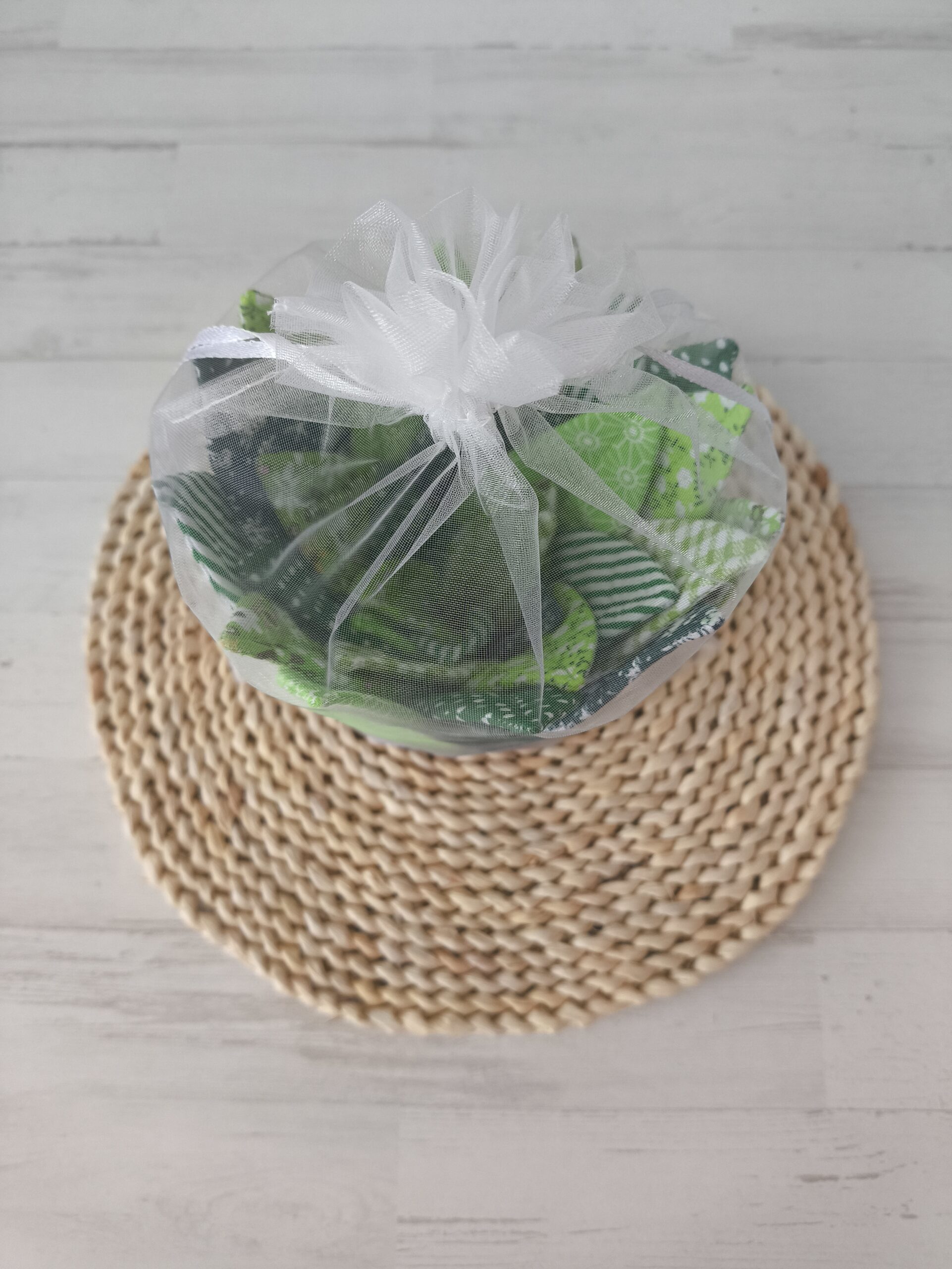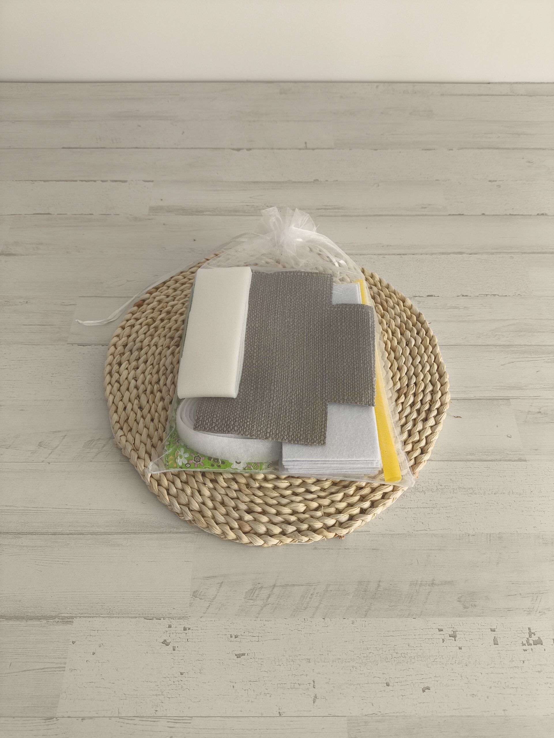 Se incluye: telas para planta y maceta, fieltro para el relleno, pajita para dar la vuelta a los pétalos, velcro, patrones y guía (a través de código QR).