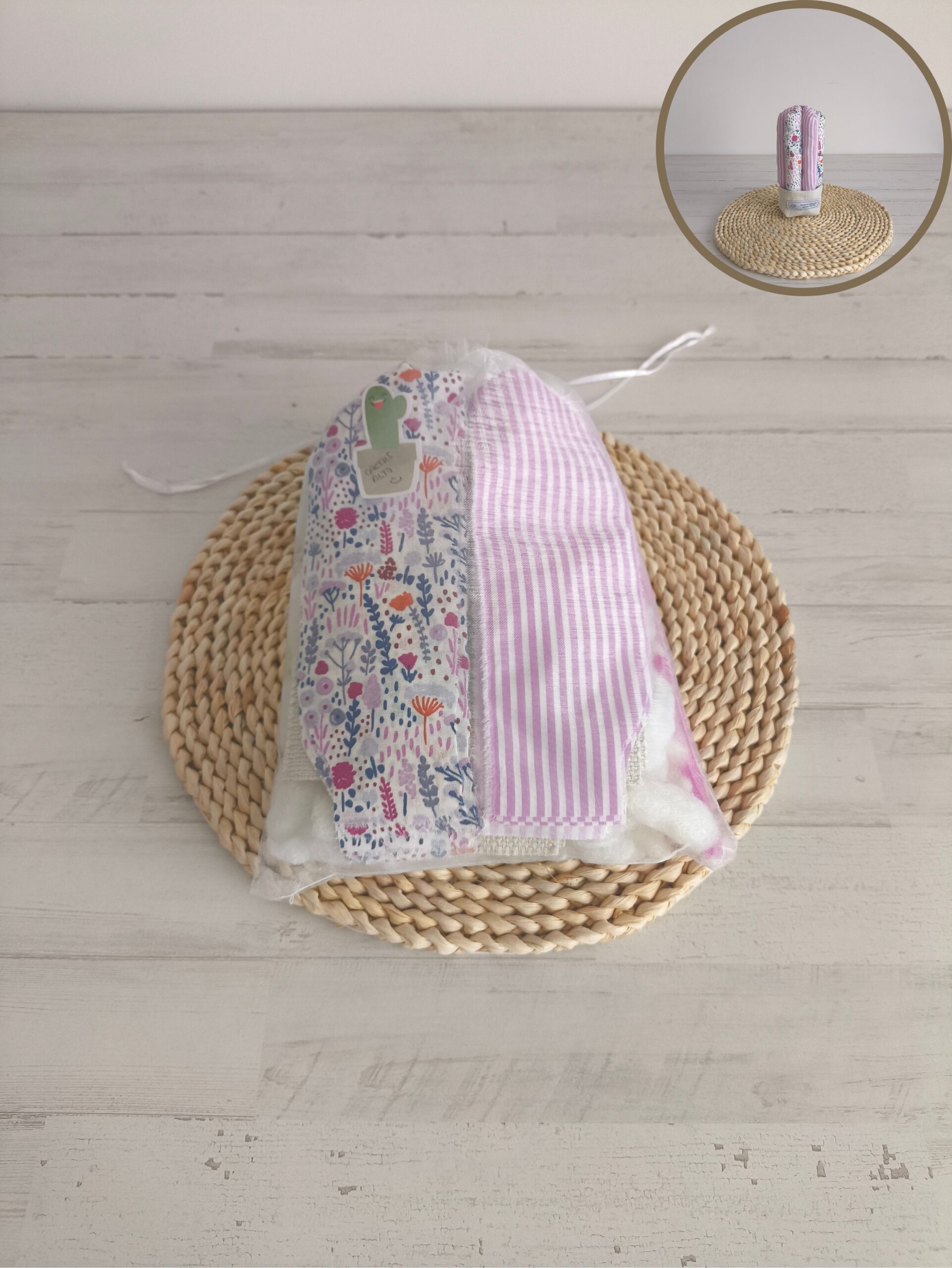 Se incluye: telas para planta y maceta, copos de fibra para el relleno, patrones y guía (a través de código QR).