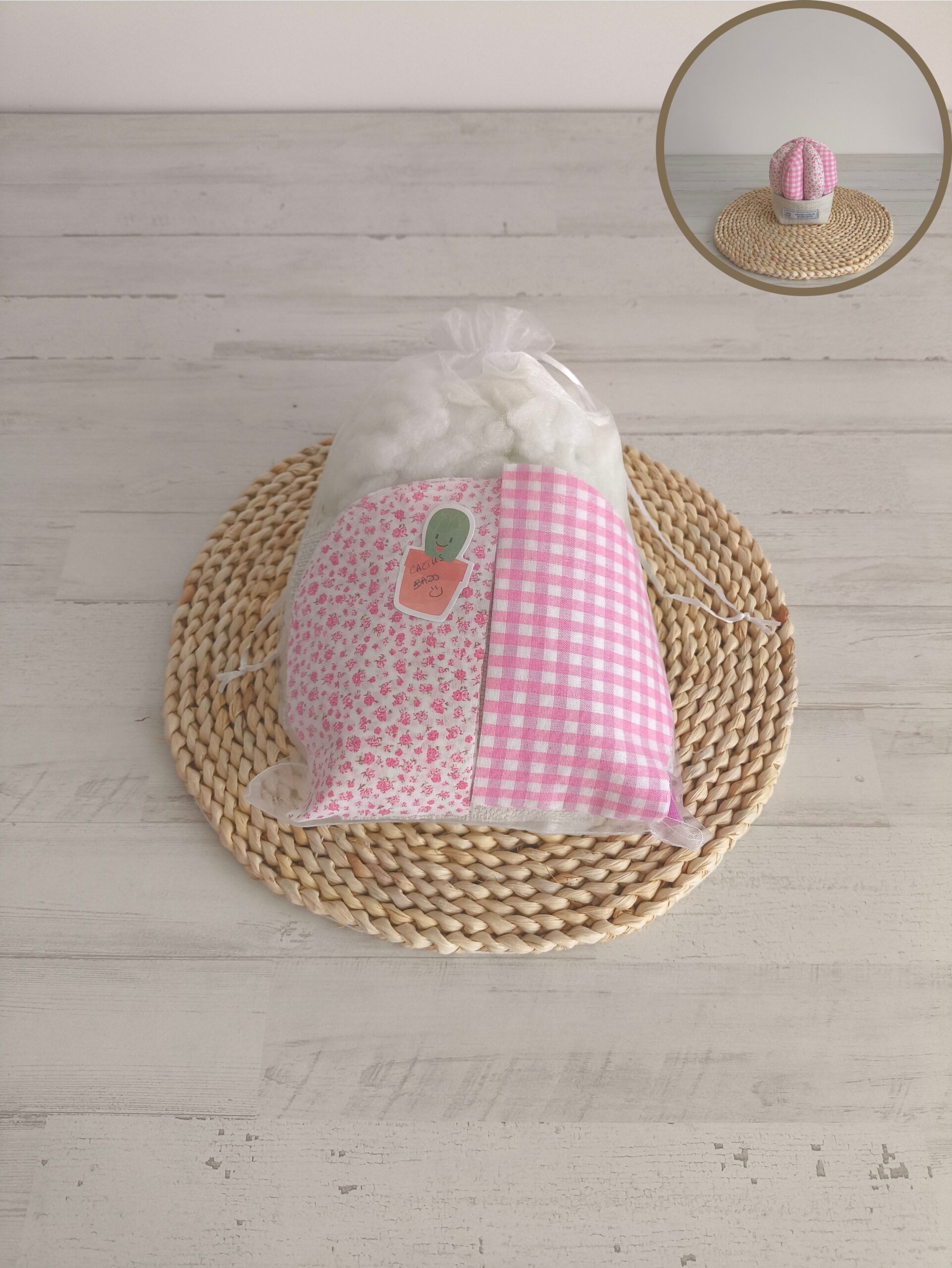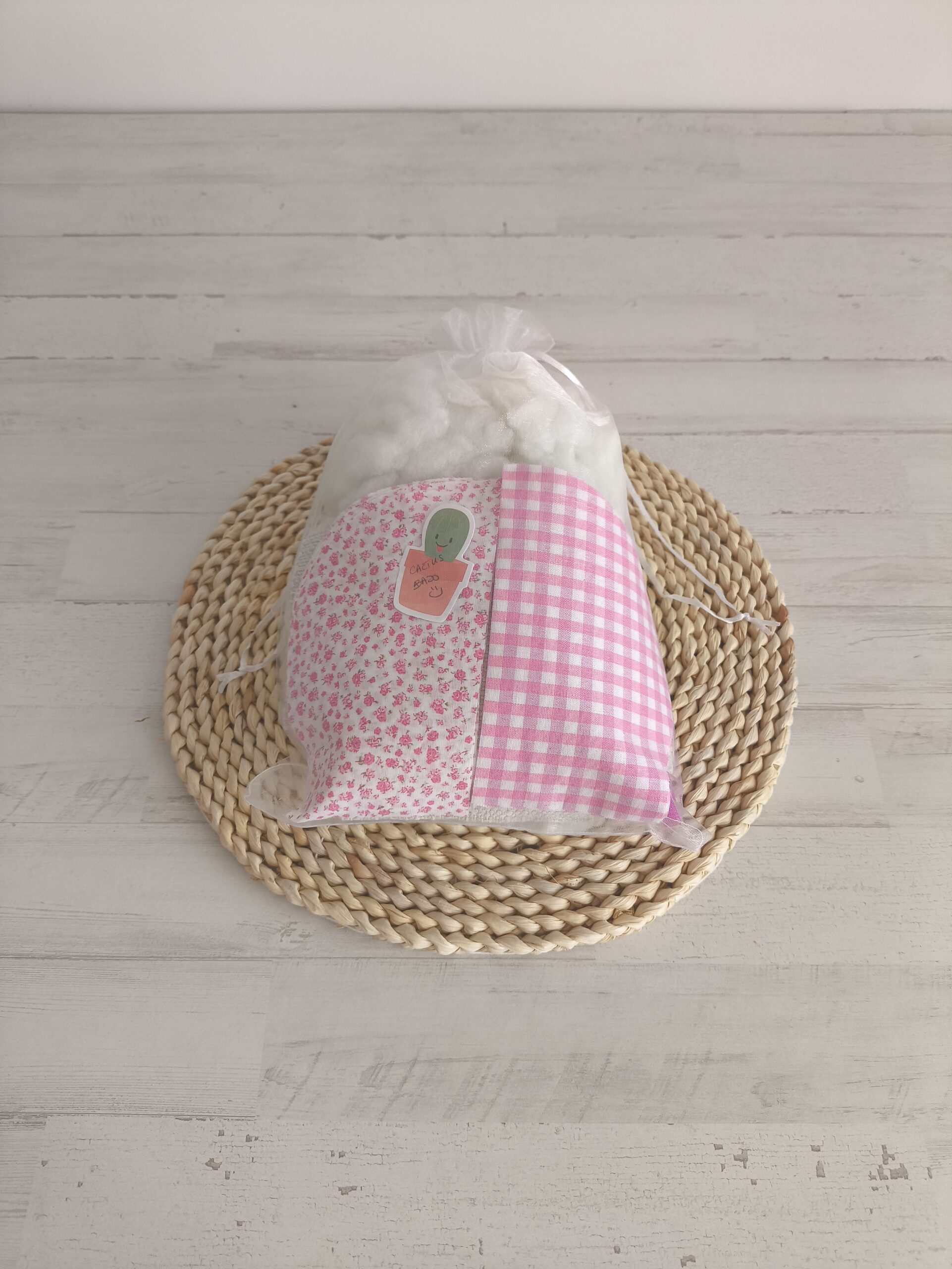 Kit para coser un cactus bajo en tonos rosas.