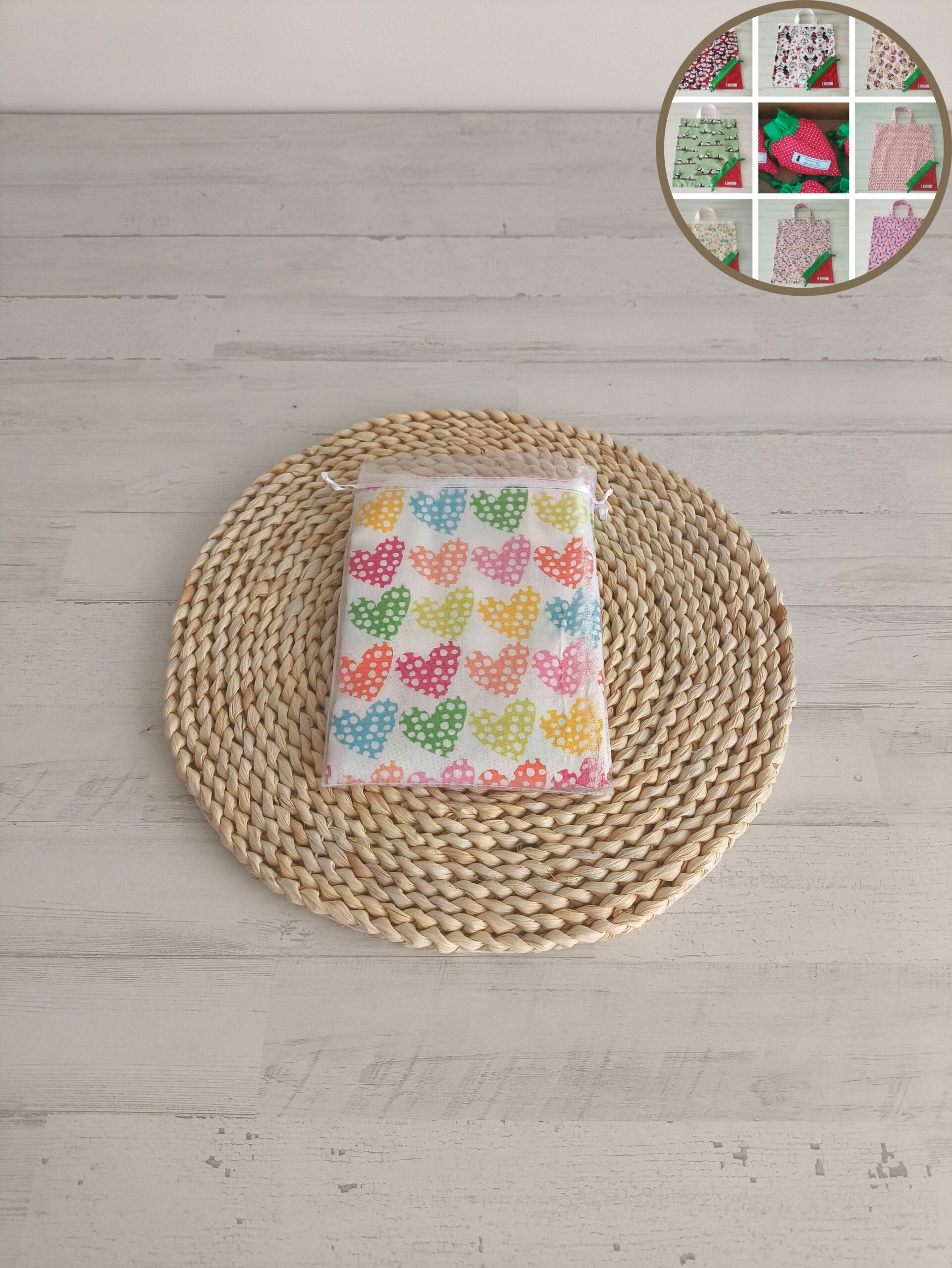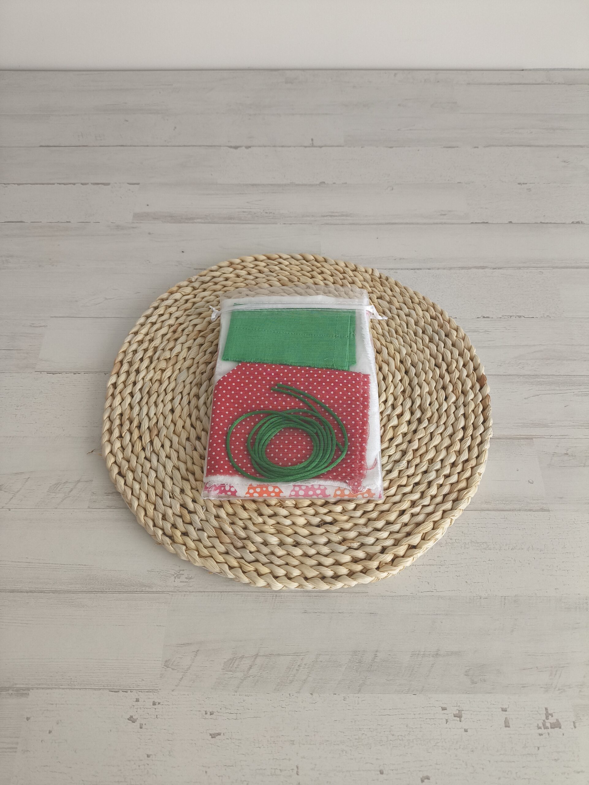 Se incluye: telas para la bolsa, la fresita, el sépalo (parte verde), asas, cordones para el cierre, patrones y guía (a través de código QR).
