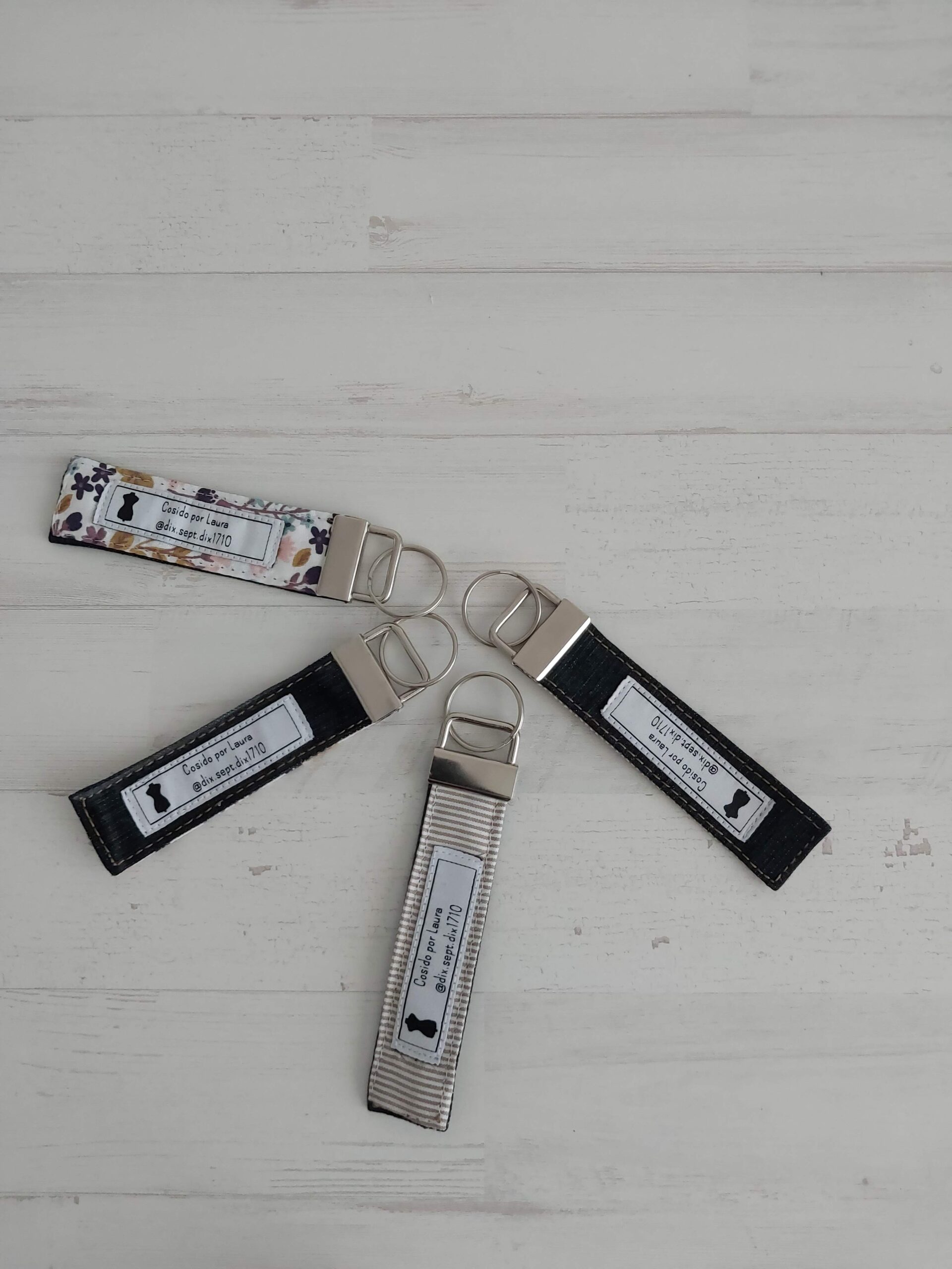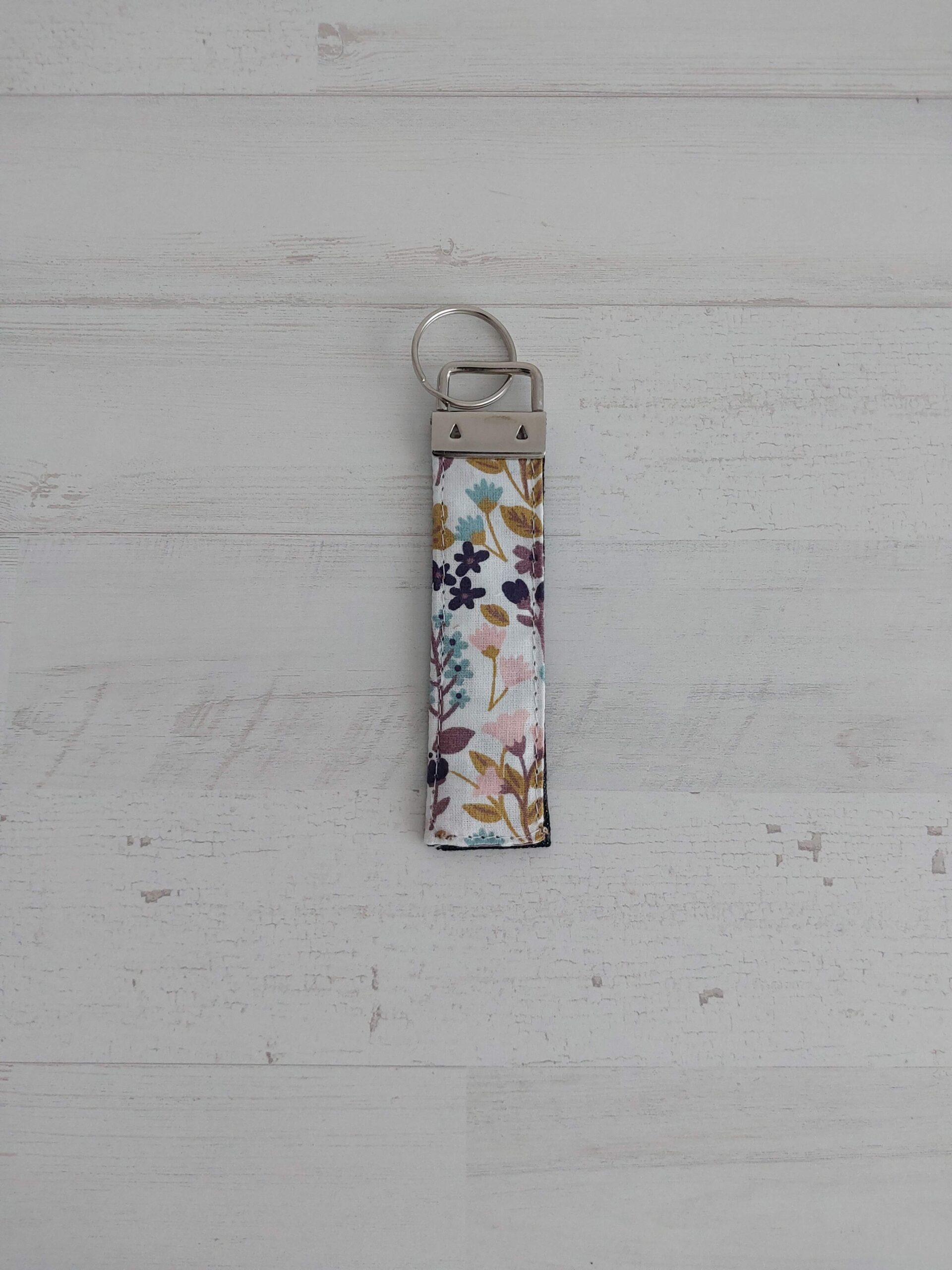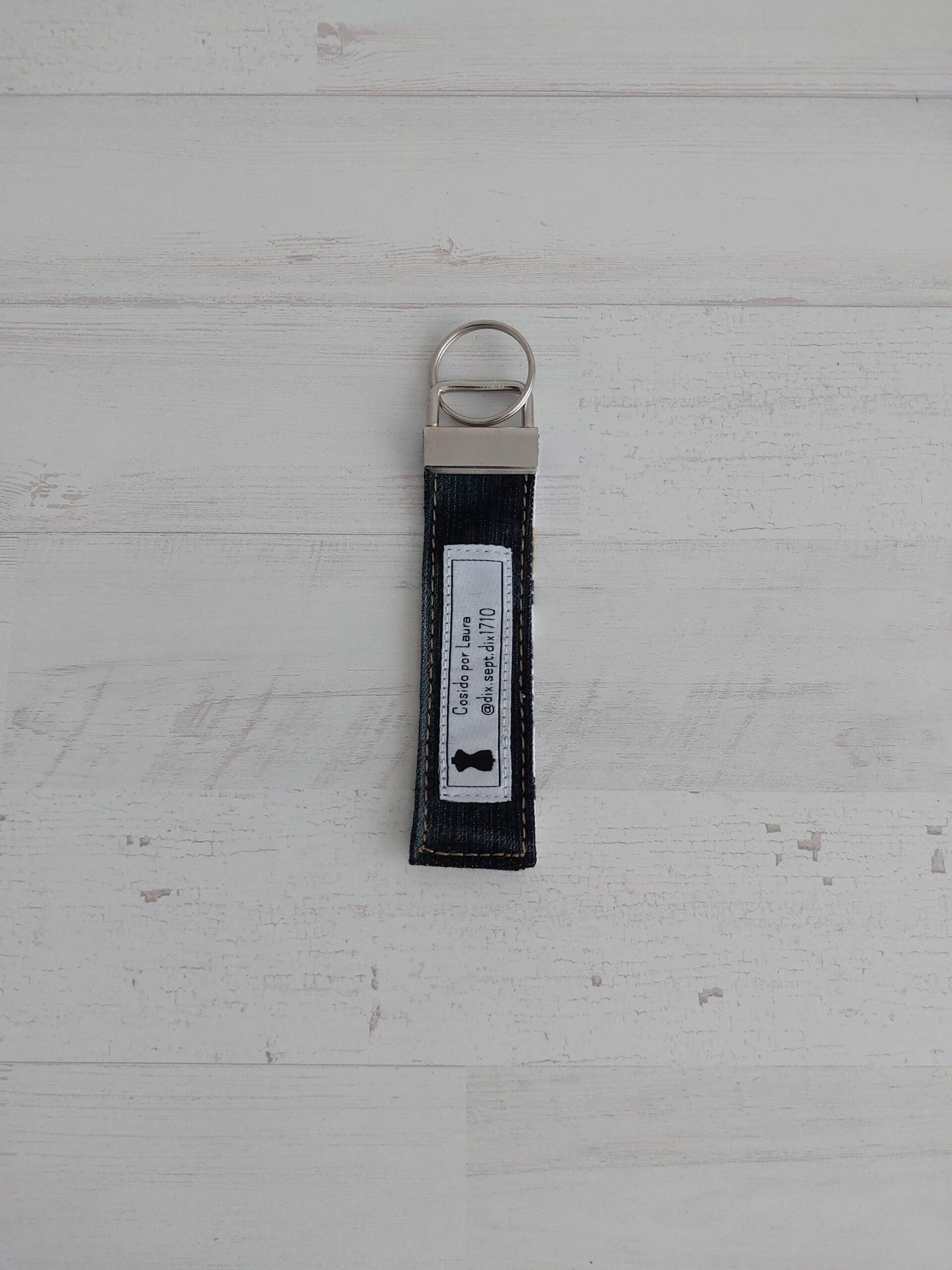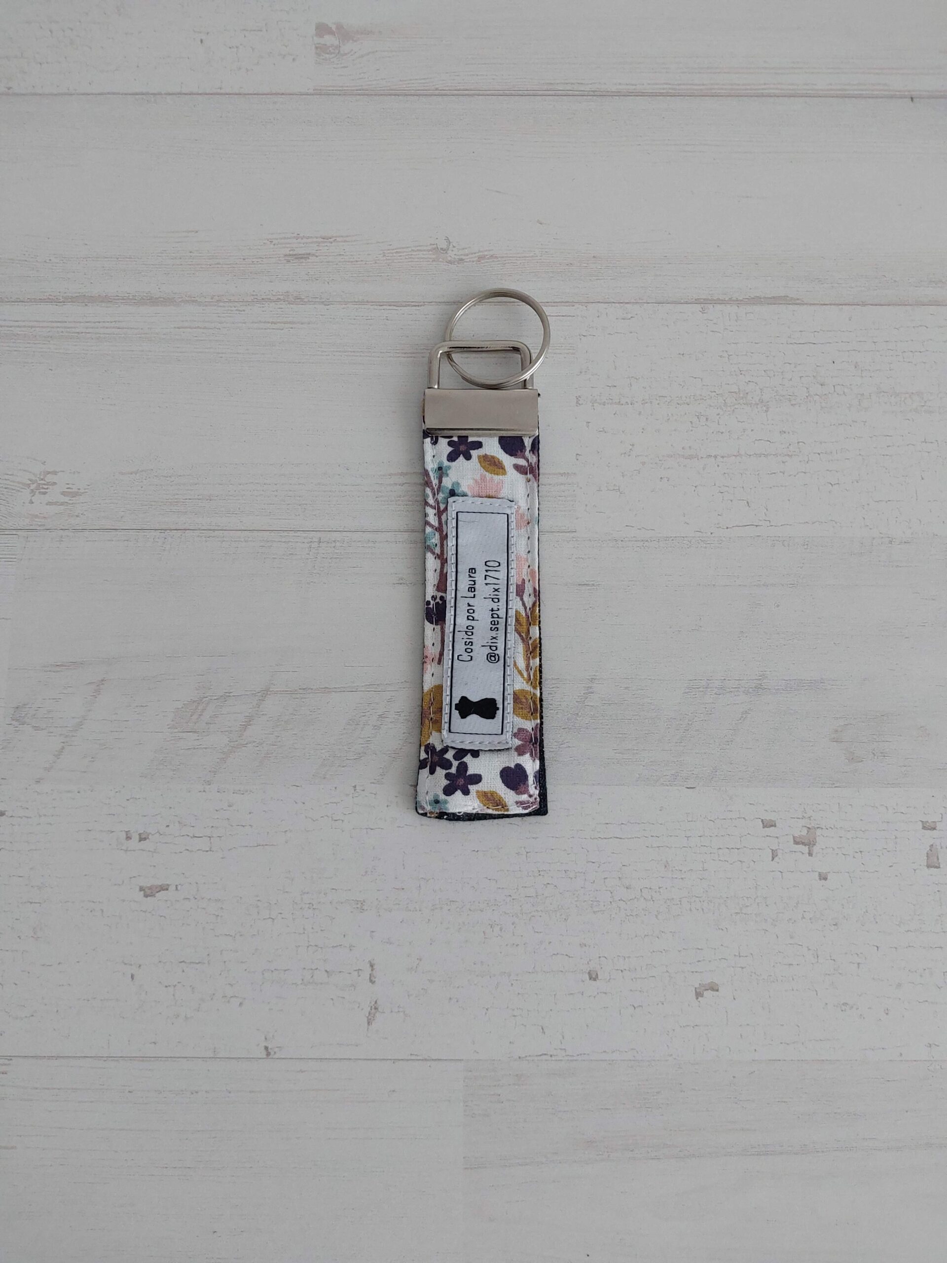 Llavero plano mixto con tela vaquera y tela de flores rosas, moradas y azules.