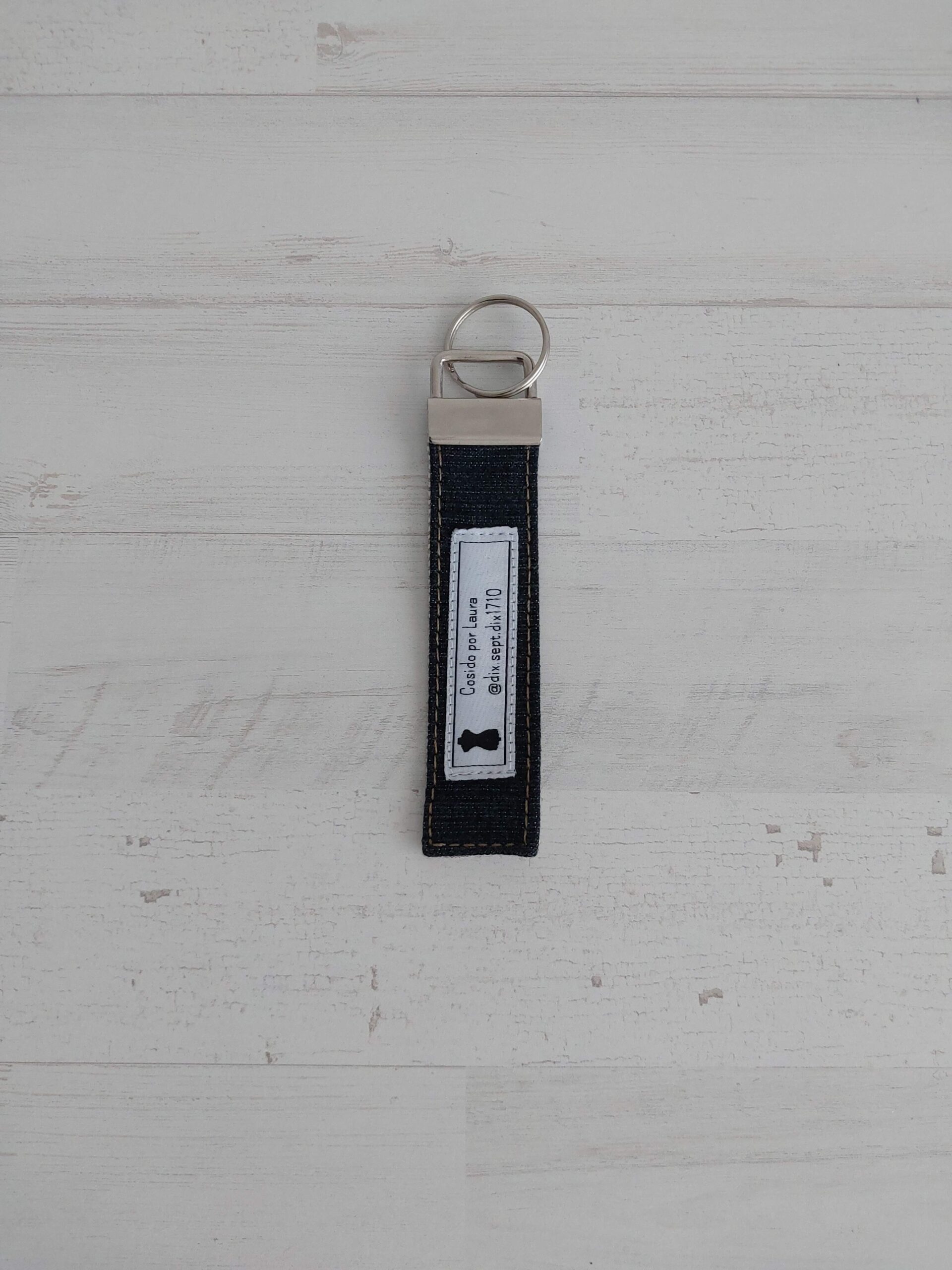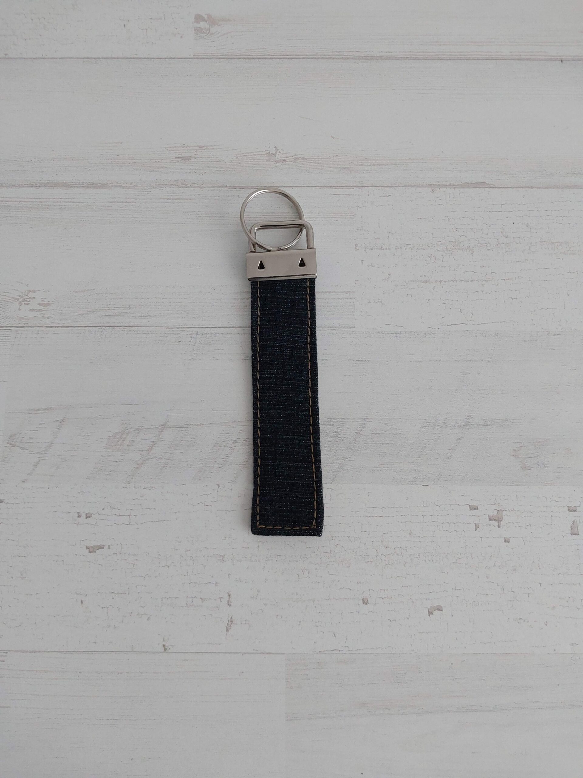Llavero plano mixto tela vaquera y rayas blancas y beiges