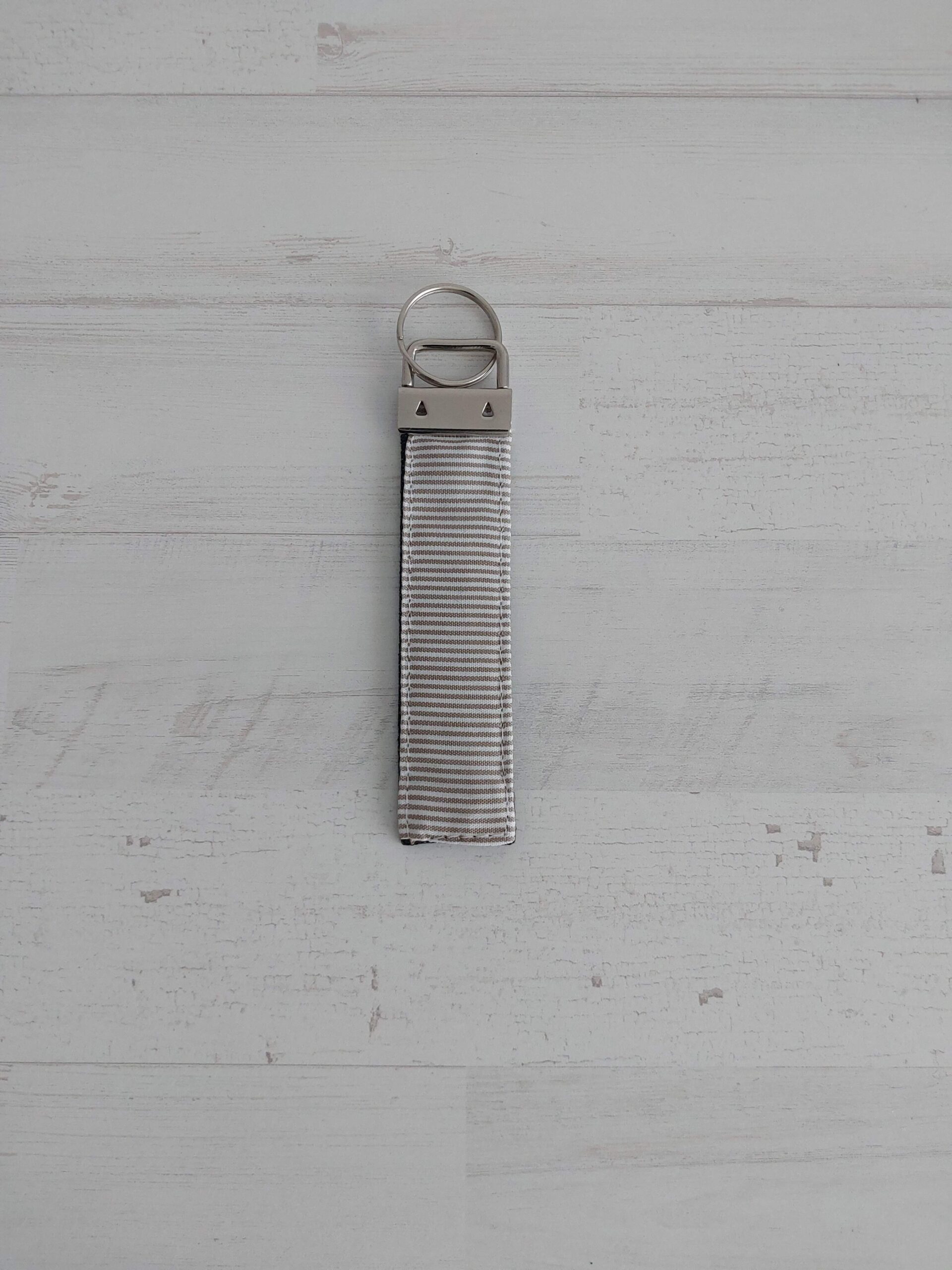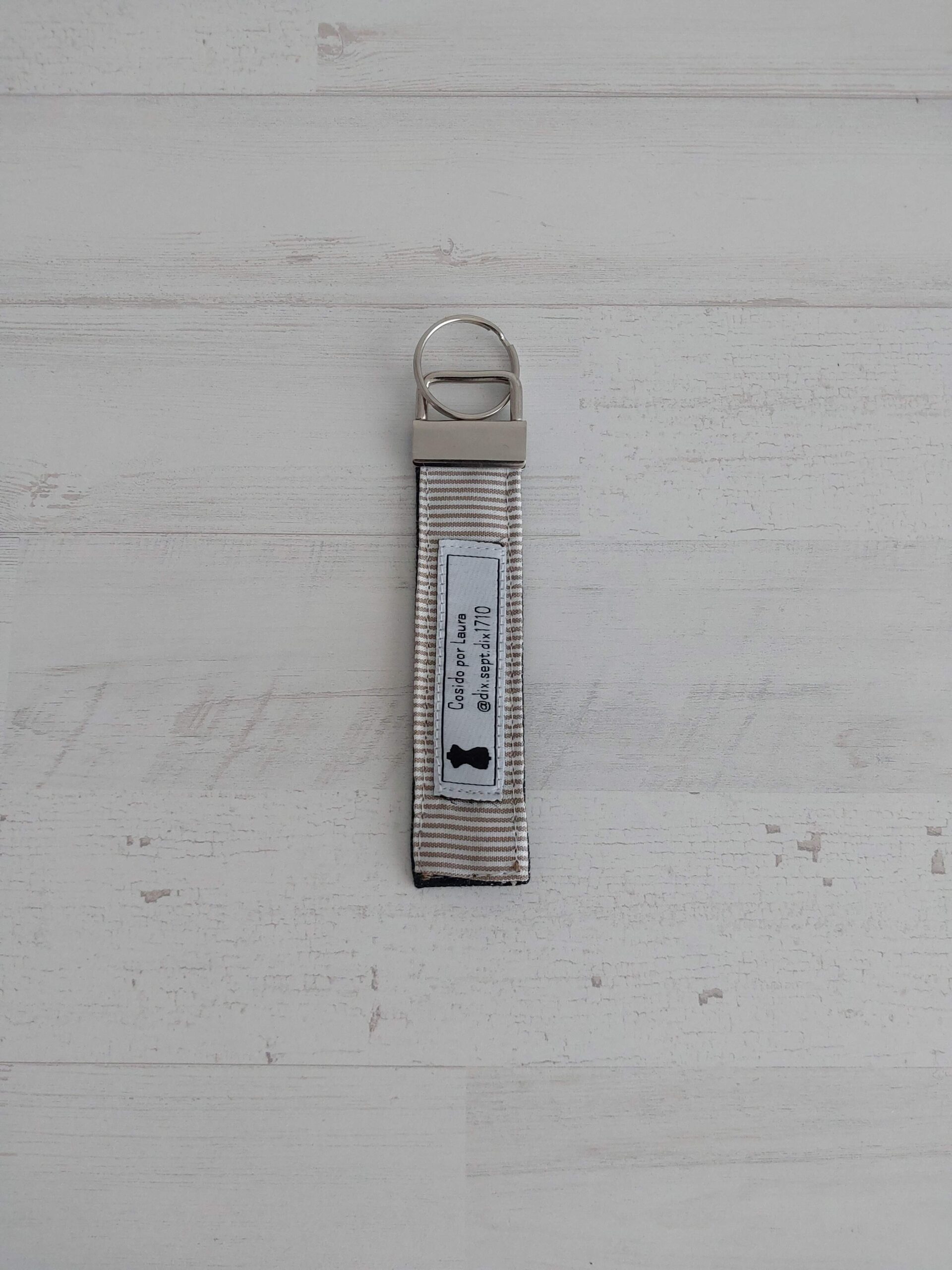 Llavero plano mixto con tela vaquera y tela de tela de rayas blancas y beiges.