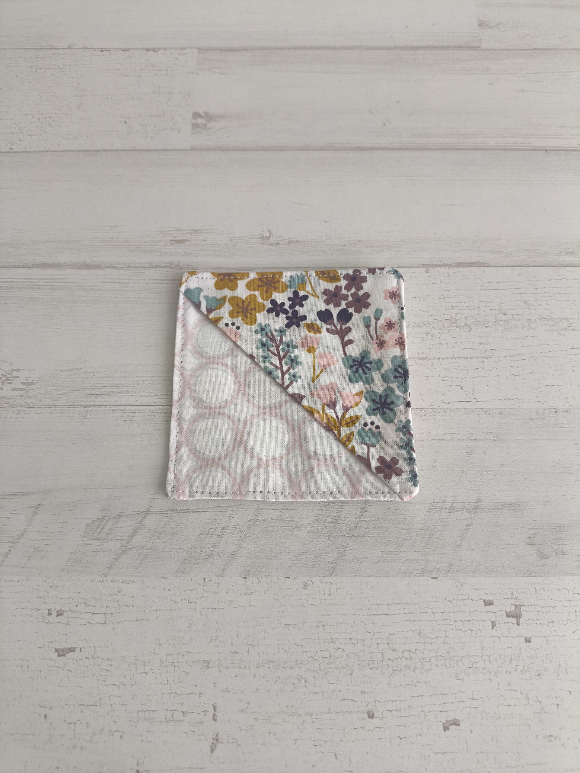 Marcapáginas de tela, estampado de flores rosas, ocres y azules.