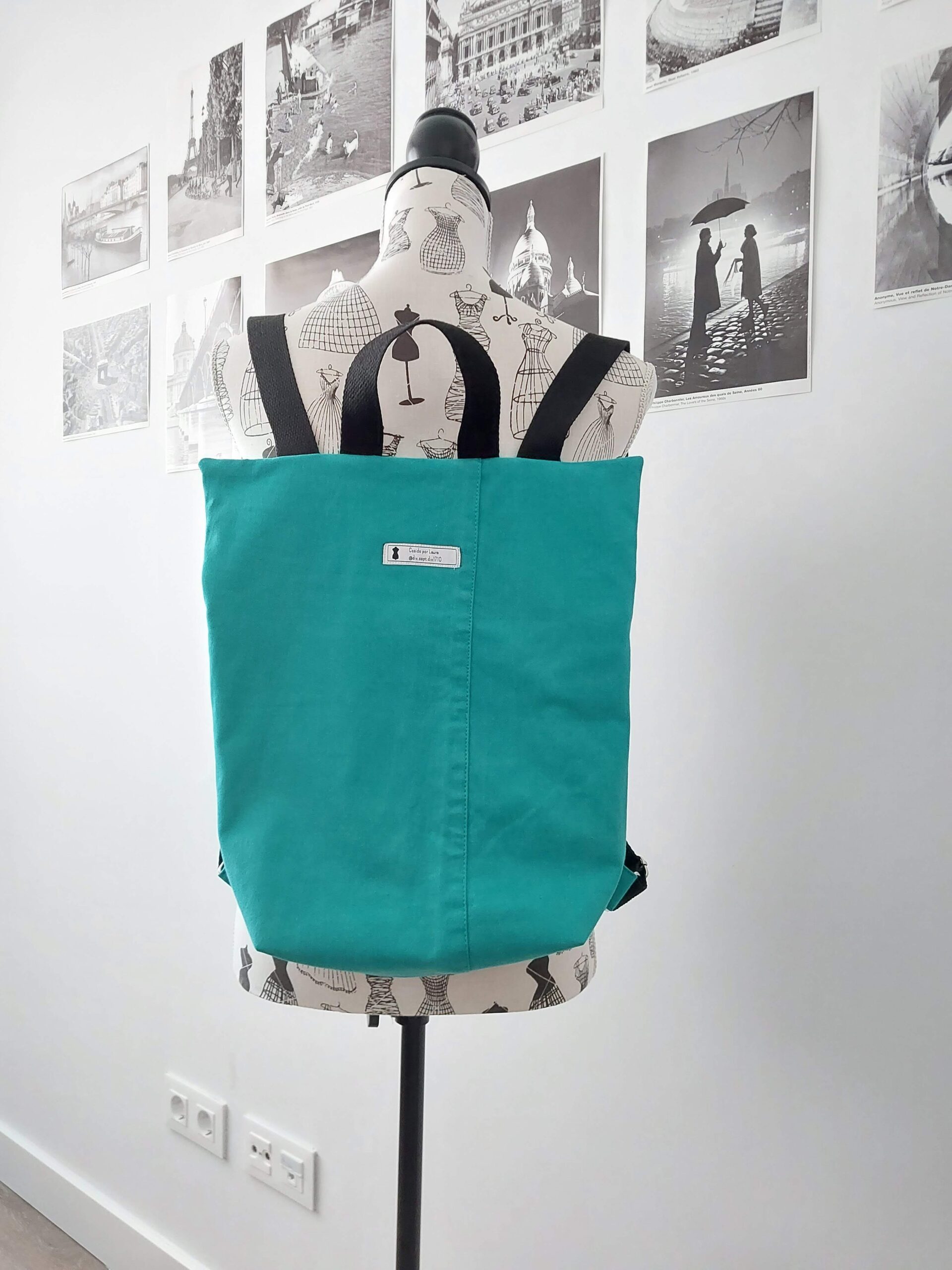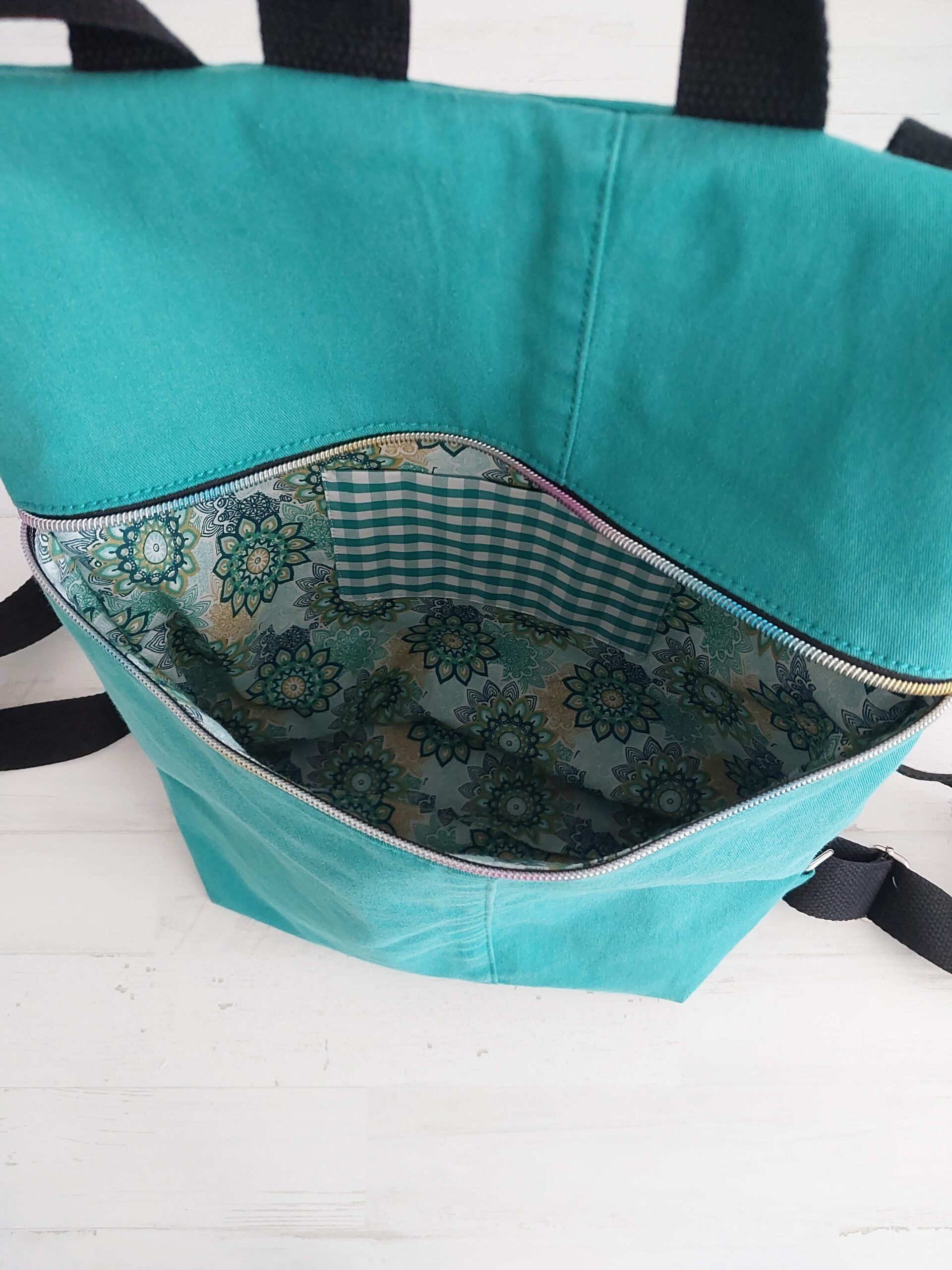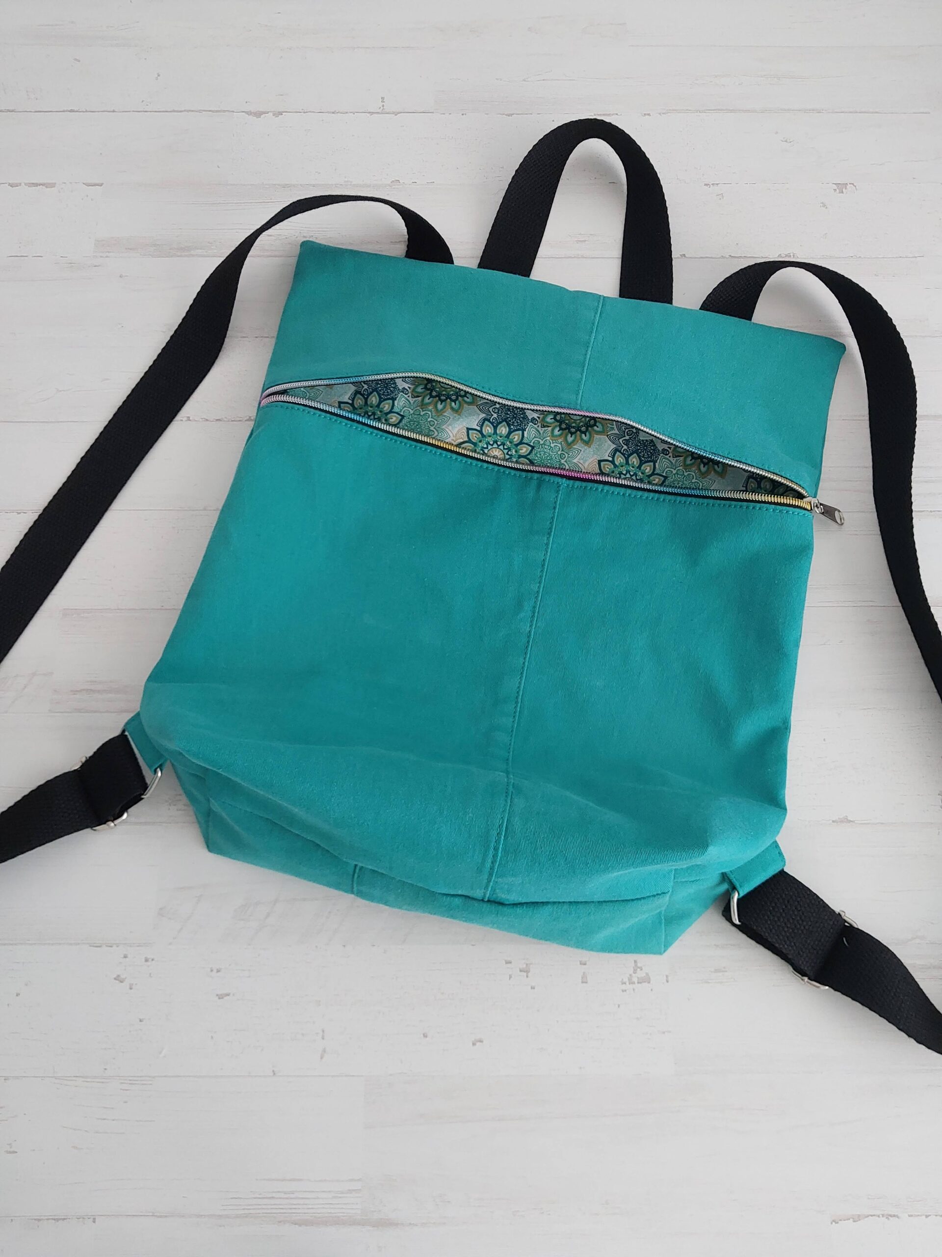 Mochila con tela vaquera verde combinada con tela de mandalas. Bolsillo interior en vichy verde. Asas ajustables. Medidas 33 x 38 x 10 cm.