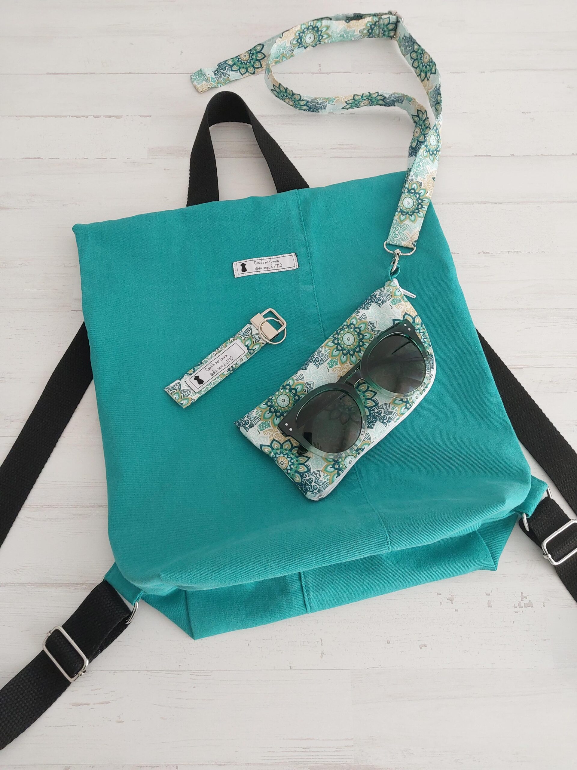 Mochila, funda de gafas y llavero