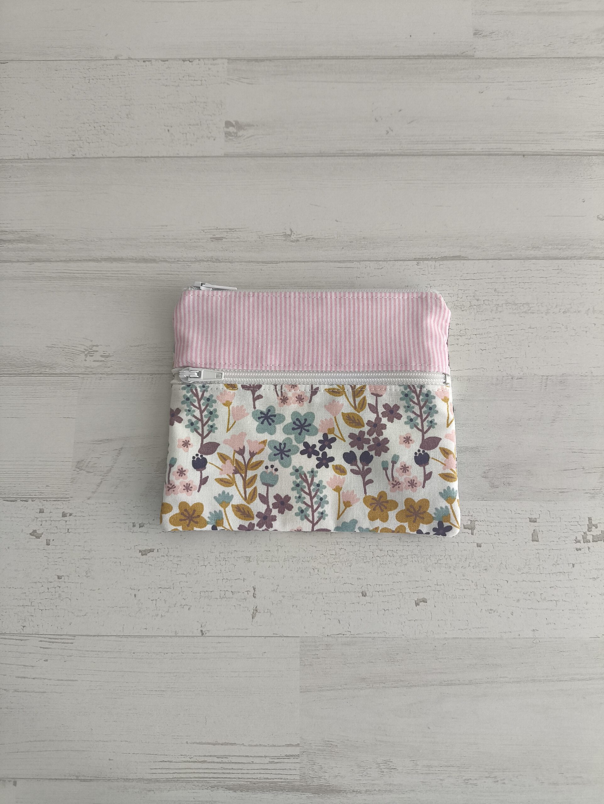 Monedero con estampado de rayas rosas y flores moradas, rosas y mostaza. Medidas monedero: 13,5 x 10,5 cm.