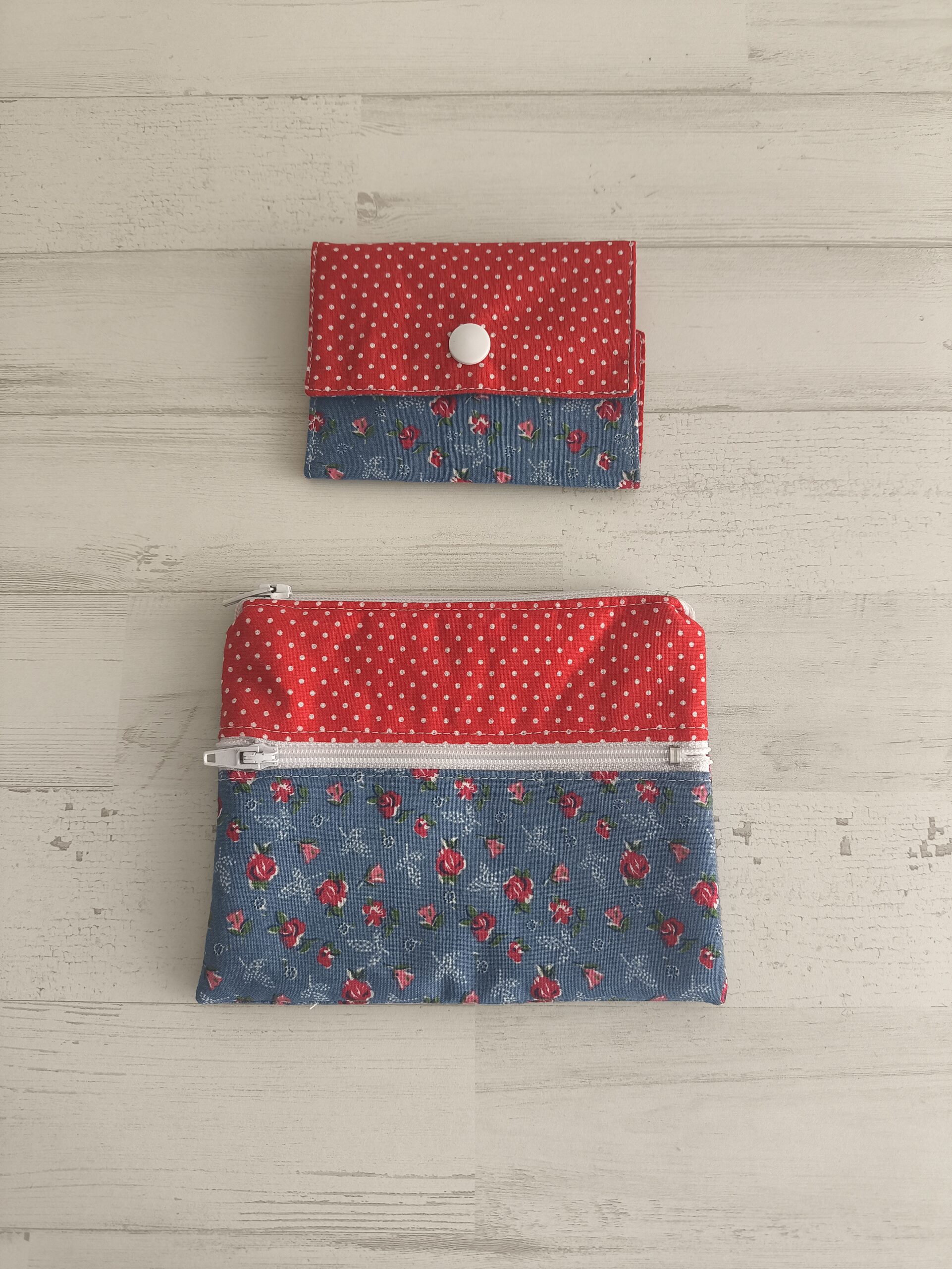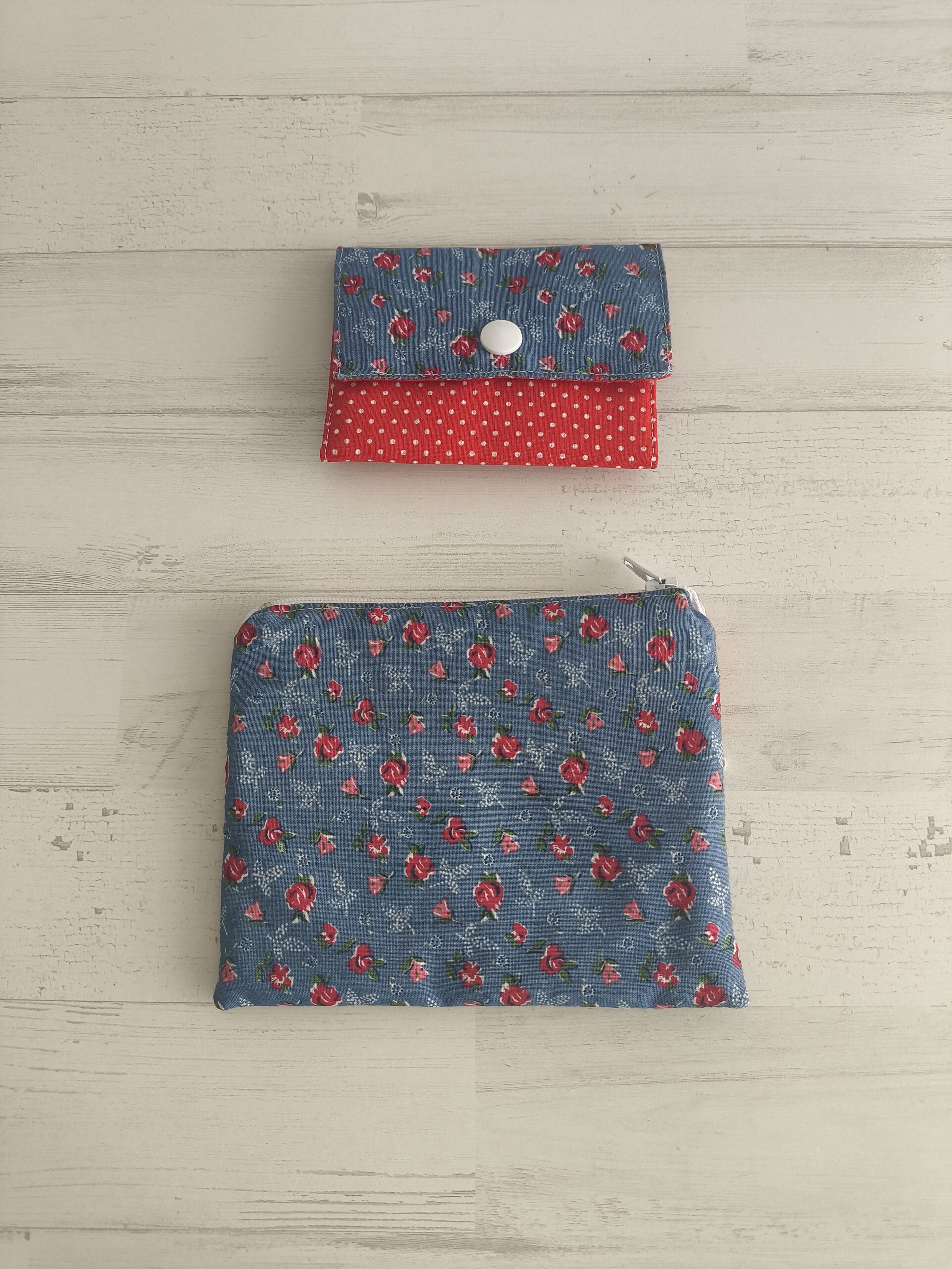Pack de monedero y tarjetero con estampado rojo y flores.