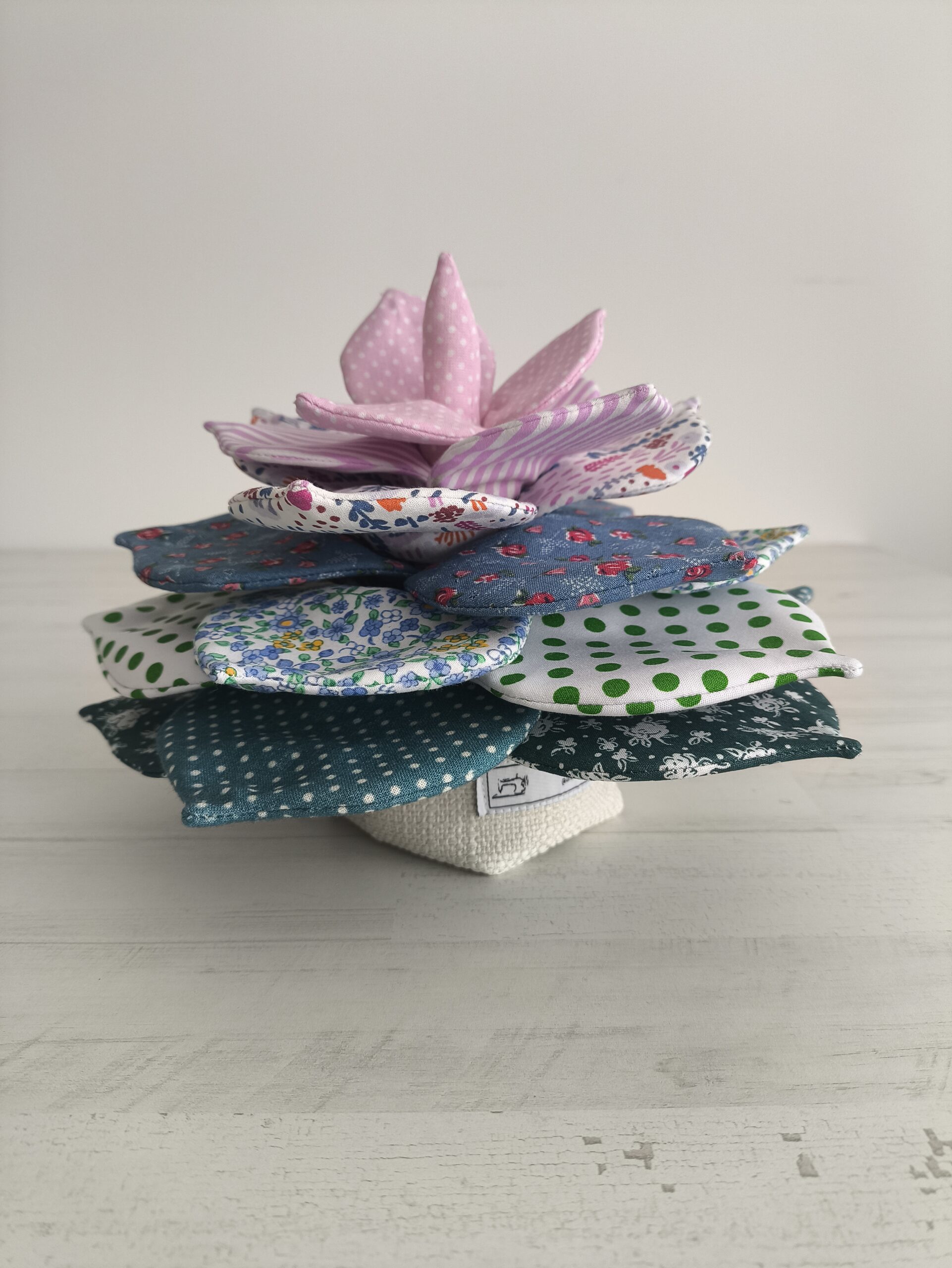 Planta suculenta en gama de colores de verde a rosa, fiel a un ejemplar real.