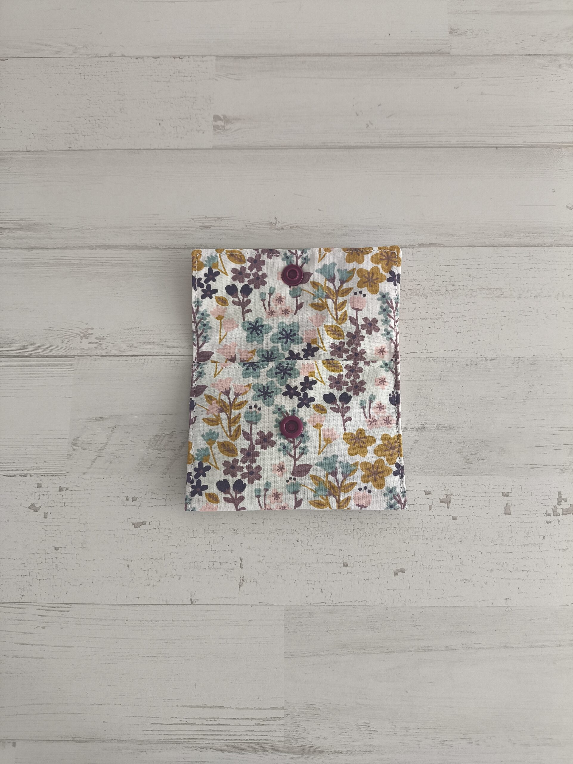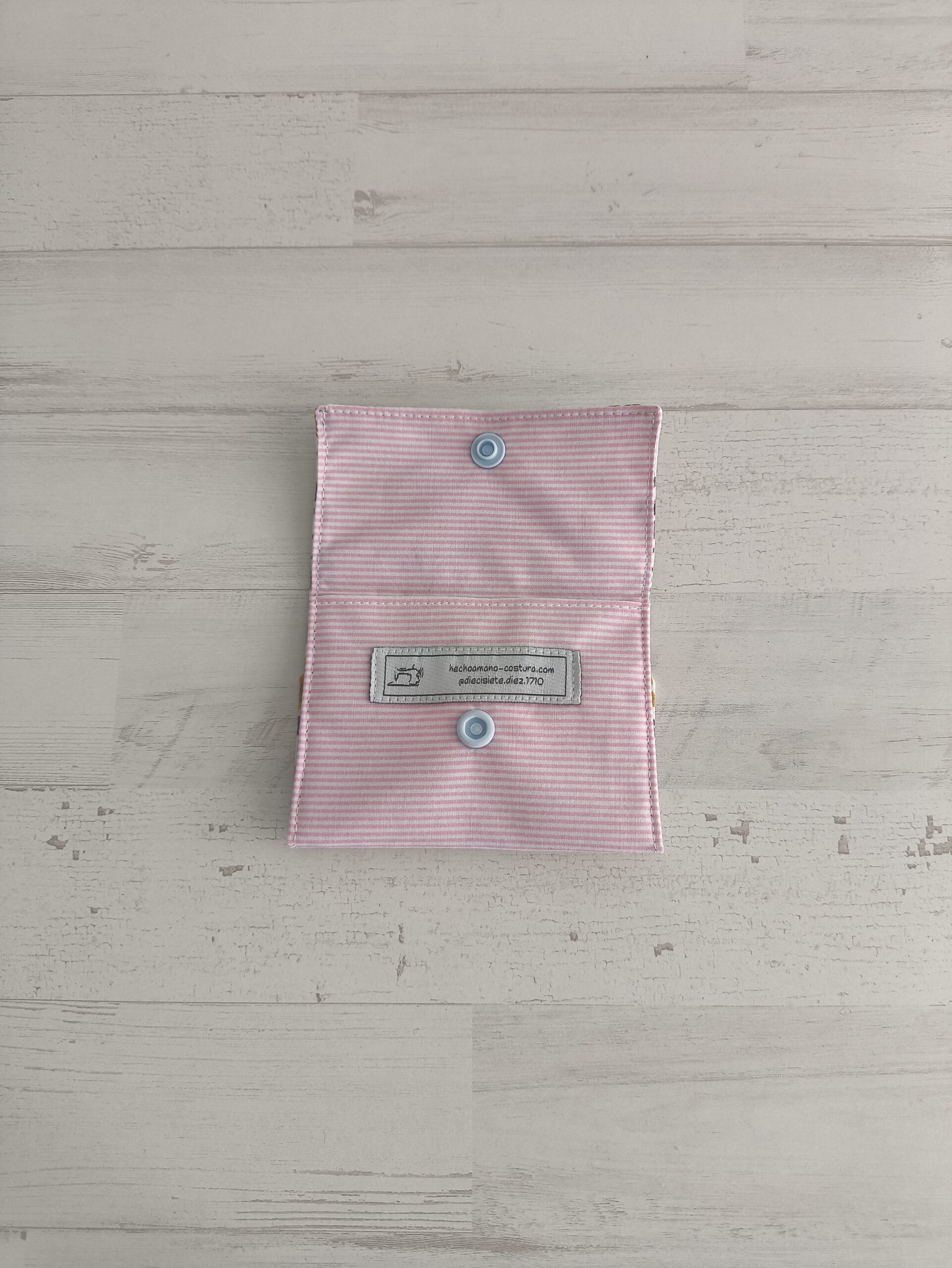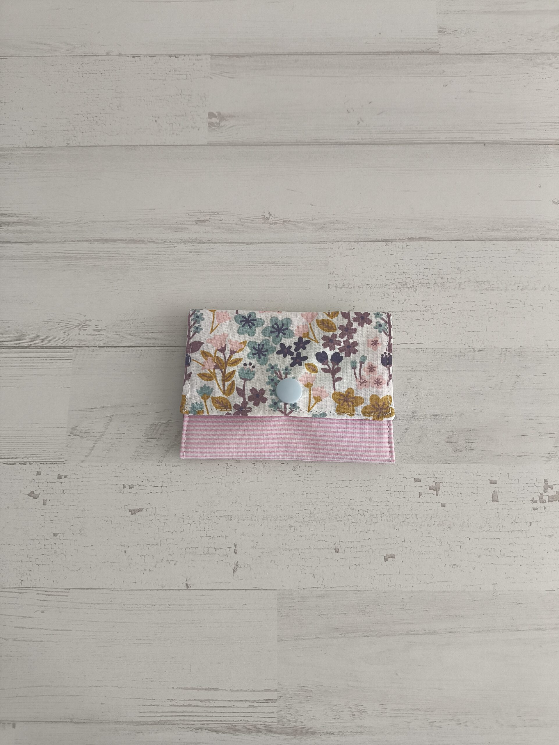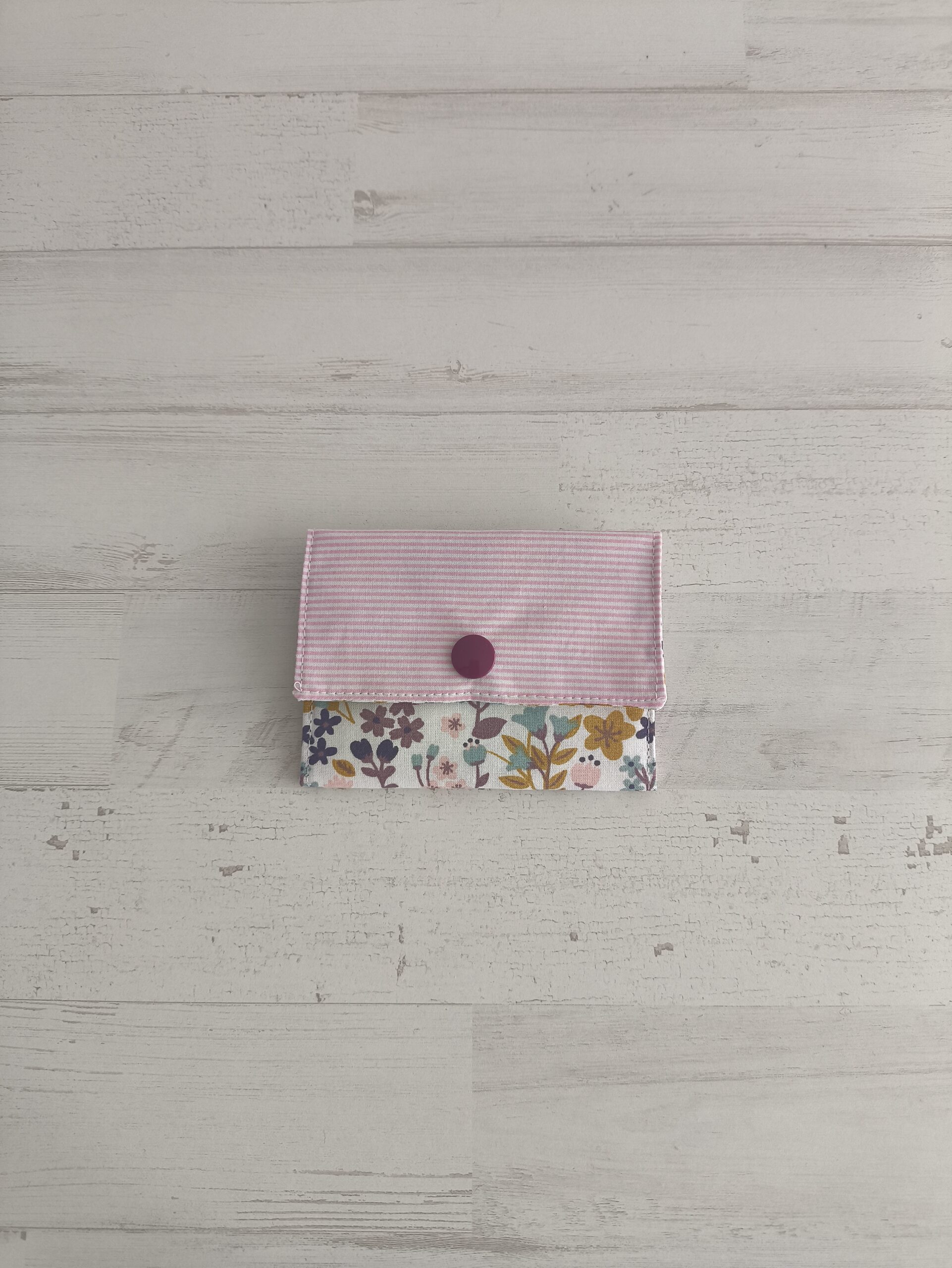 Tarjetero con estampado de rayas rosas y flores moradas, rosas y mostaza. Medidas Tarjetero: 9 x 6 cm.